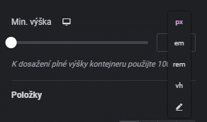 Nastavte minimální výšku obsahu Kontejneru. Použijte posuvník nebo ručně zadejte hodnotu pro nastavení požadované minimální výšky Kontejneru. Nejčastěji se používá nastavení v PX nebo VH.