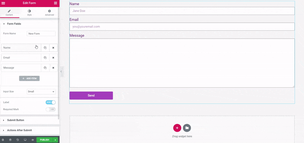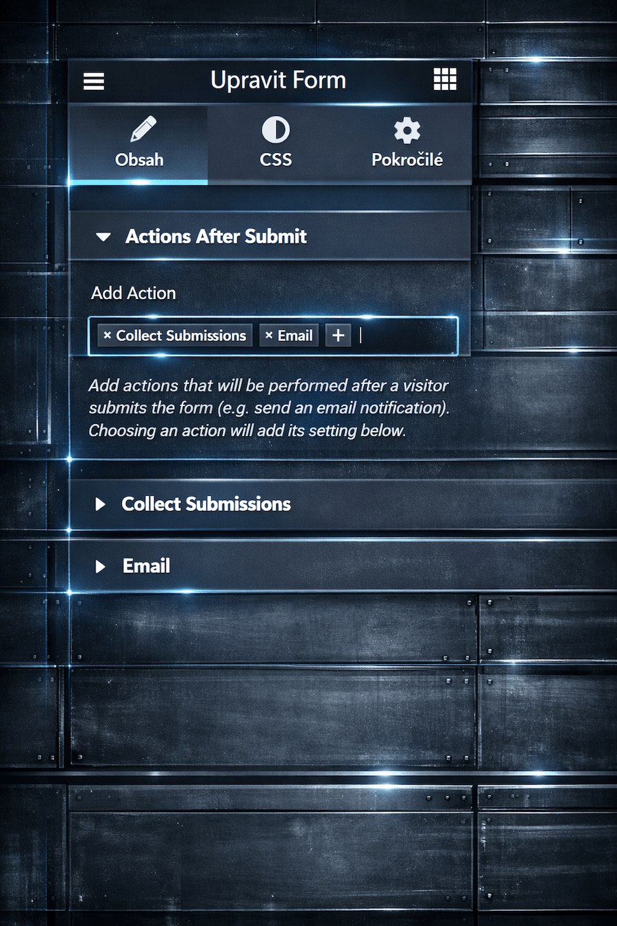 Sbírá údaje, které jsou vyplněné návštěvníkem a ukládá je. Údaje najdete ve WordPress nástěnce – Elementor – Submissions.