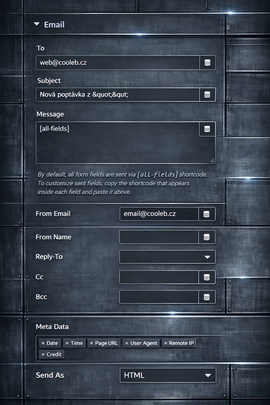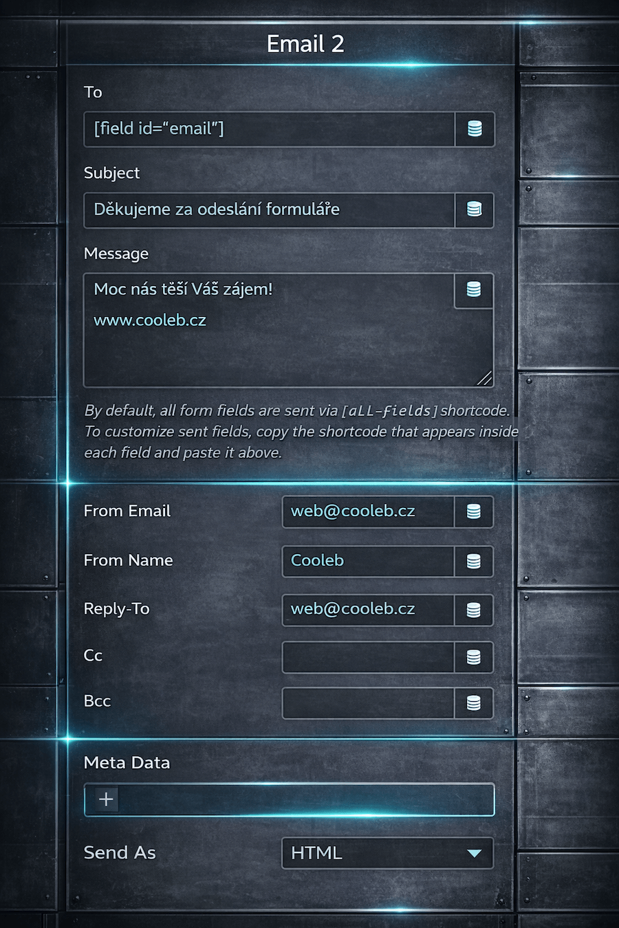 Tělo e-mailu. Ve výchozím nastavení jsou všechna pole formuláře odesílána prostřednictvím krátkého kódu: [all-fields]. Chcete upravit, která pole se odesílají? Zkopírujte krátký kód v části Advanced, který se zobrazí uvnitř polí (Form fields), která chcete odeslat a vlož je sem.