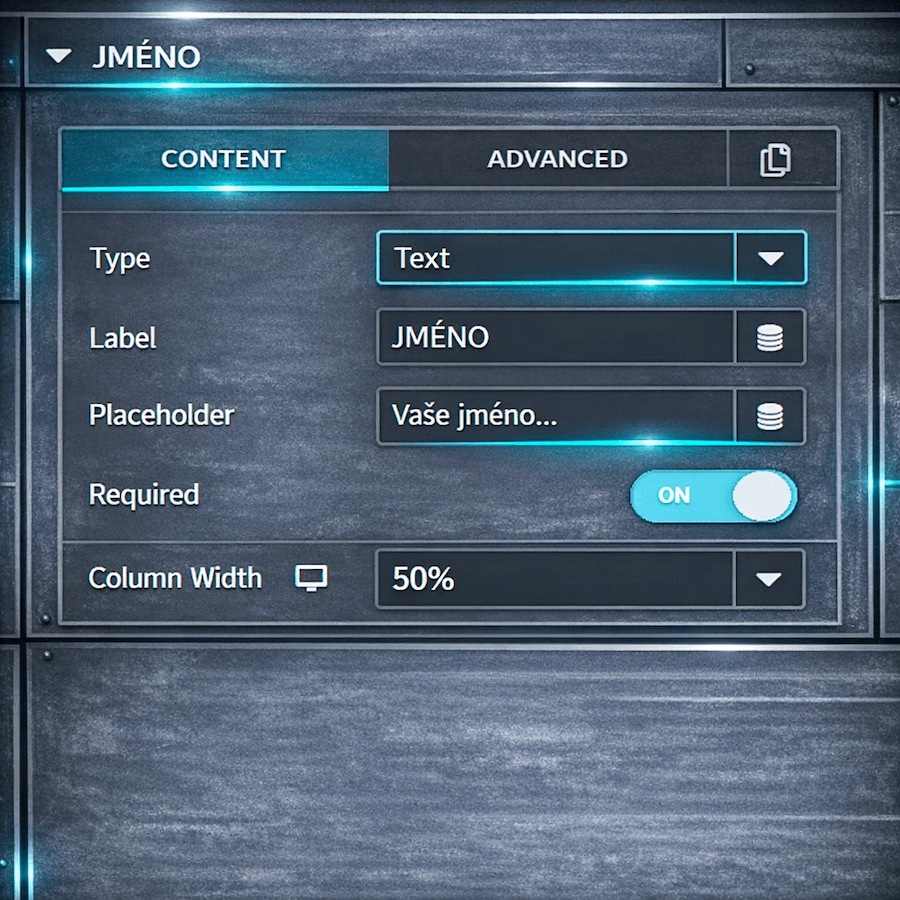 Umožňuje nastavit šířku pole. Pokud chcete formulář se dvěma poli v jednom řádku – nastavte každé pole na 50 %.